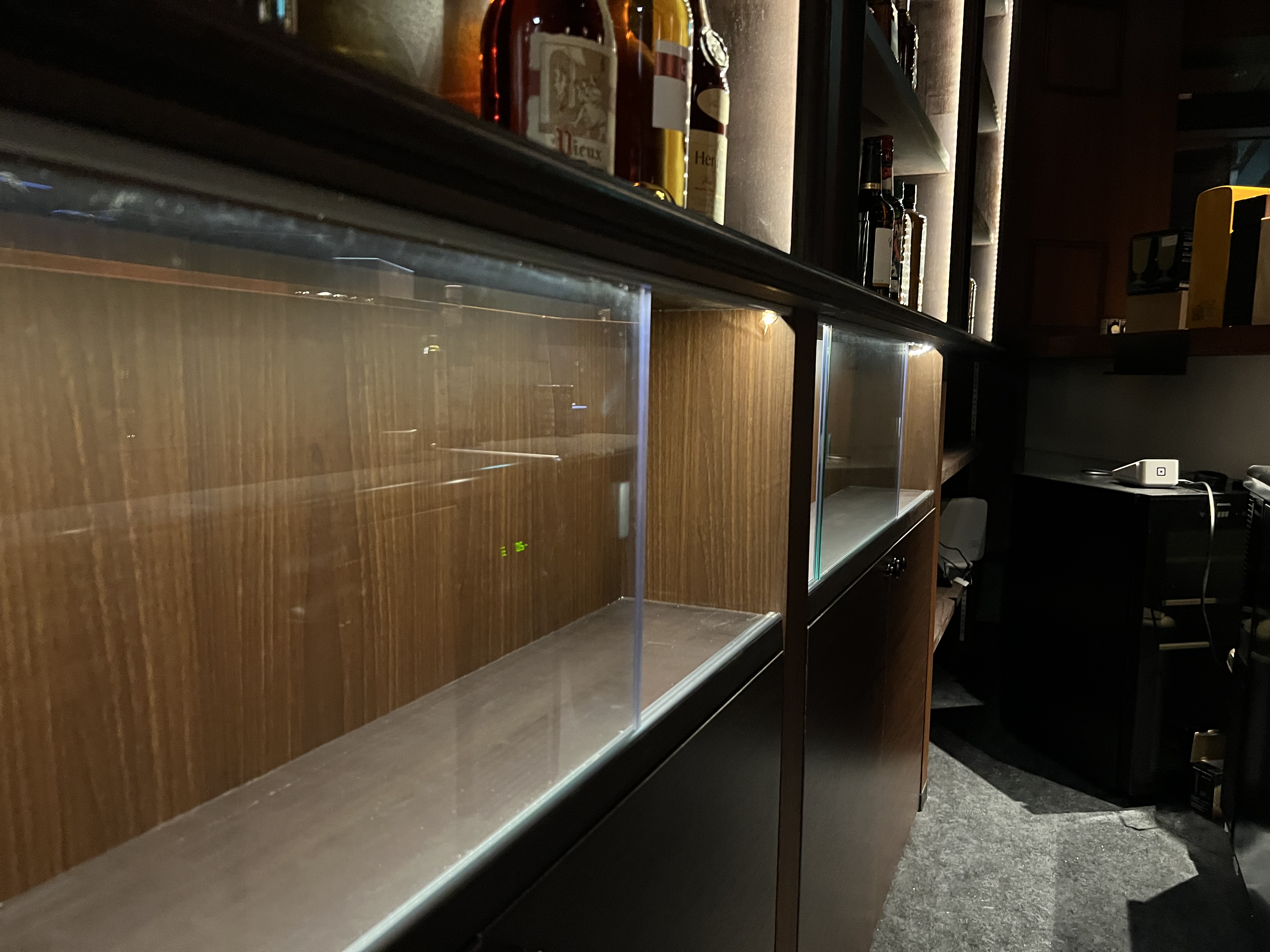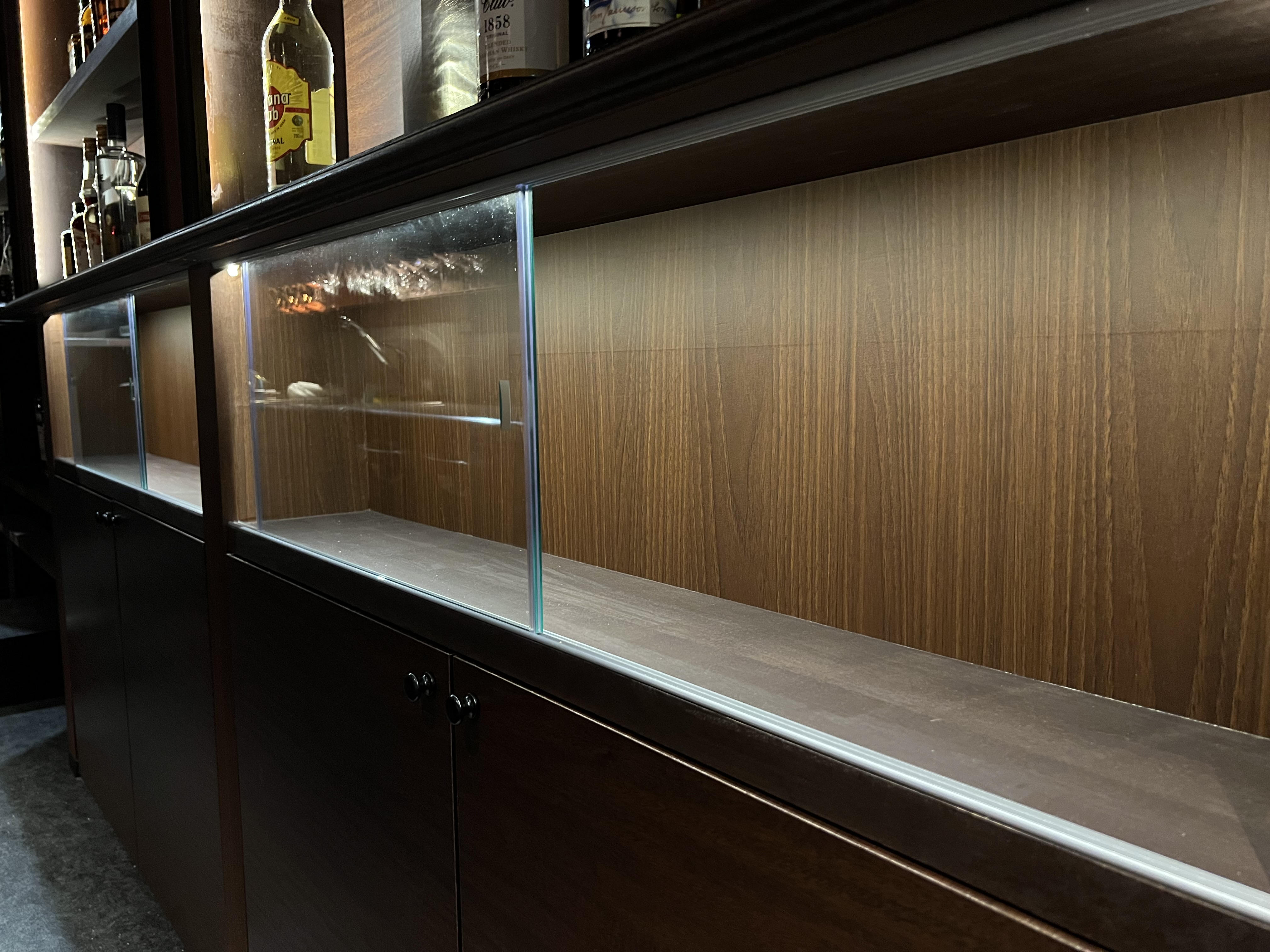 工事が完了した後、オーナー様から「下の棚にもテープライトを追加してほしい」とのご依頼をいただきました。これがなかなかの難題で、配線の作業にかなり苦労しました。まずコンセントの増設が必要になり、さらに棚の加工やテープライトの取り付けと、一日中ハードな作業が続きました。それでも、最終的には綺麗に仕上げることができ、オーナー様にもご満足いただけたようでホッとしています。今回の作業を通じて、やっぱり事前の打ち合わせの大切さを改めて実感しました。これで全ての作業が終了です。最後までご協力いただいた皆様、本当にありがとうございました!